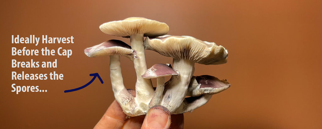 The best time to harvest is right before the veil breaks (that thin membrane under the cap). If you wait too long, the mushrooms will drop spores and won’t store as well.